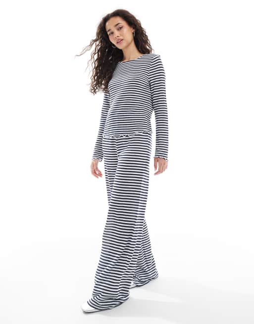 Object - Completo in jersey a coste blu navy a righe con top a maniche lunghe e pantaloni a fondo ampio