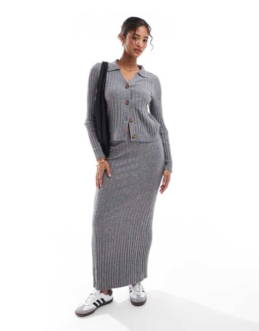 Object - Coordinato grigio mélange a coste con polo con bottoni e gonna lunga