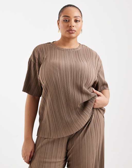 ONLY Curve - T-shirt squadrata plissé marrone chiaro in coordinato