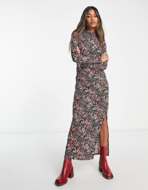 Esclusiva Only - Vestito lungo dolcevita nero a fiori con spacco laterale