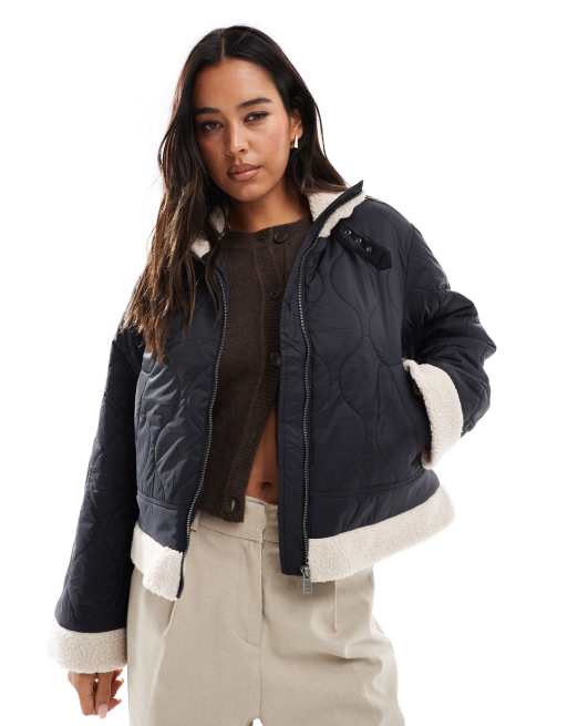 ONLY - Cappotto nero con finiture in pile e motivo trapuntato a rombi