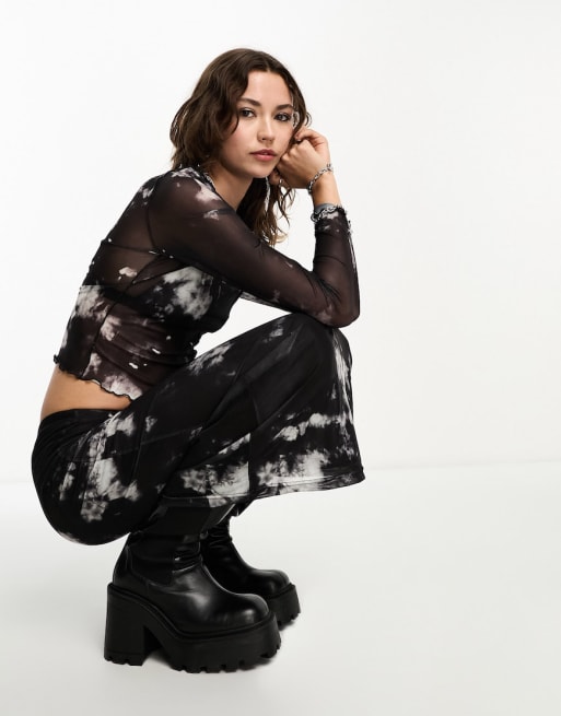 Only - Coordinato con top e gonna midi in rete nera e bianca effetto marmo
