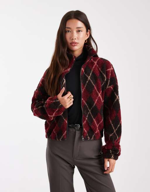 ONLY - Pile effetto teddy bordeaux a quadri con zip