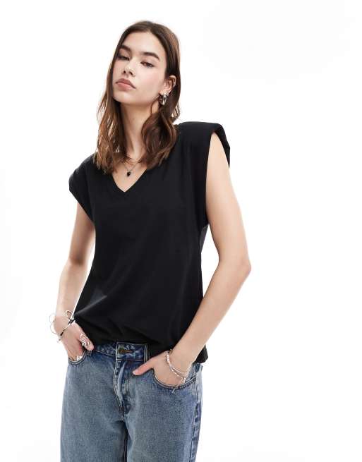 ONLY - T-shirt nera con spalline imbottite e scollo a V