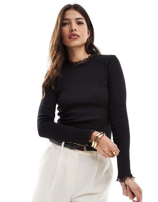 ONLY - Top a maniche lunghe nero a coste con finiture in pizzo