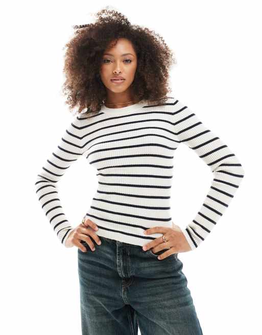 ONLY - Top girocollo a maniche lunghe in maglia beige a righe blu navy