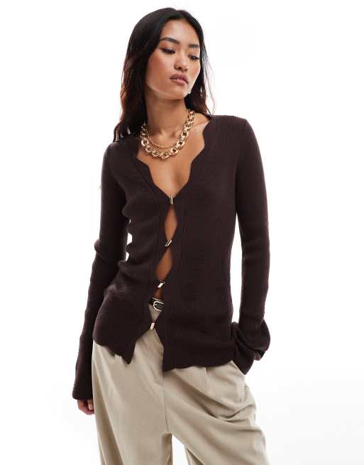 & Other Stories - Cardigan aderente marrone scuro con maniche a campana estese e davanti smerlato