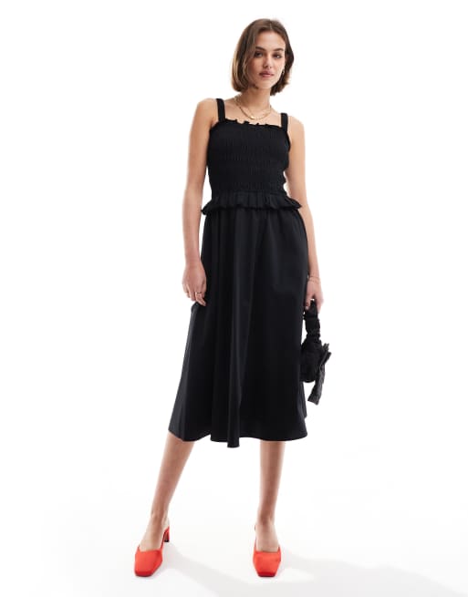 & Other Stories - Vestito midi in tessuto misto nero con fondo a ruota e corpino con scollo squadrato arricciato