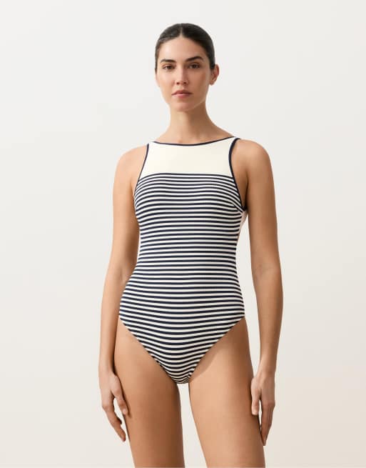 OYSHO - Costume da bagno allacciato al collo a righe écru pallido