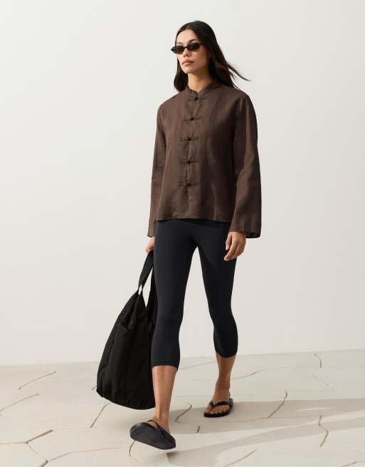 OYSHO - Giacca in 100% lino marrone con colletto alla coreana e bottoni