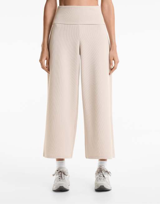 Oysho - Pantaloni a fondo ampio color visone pallido a coste con risvolto in vita