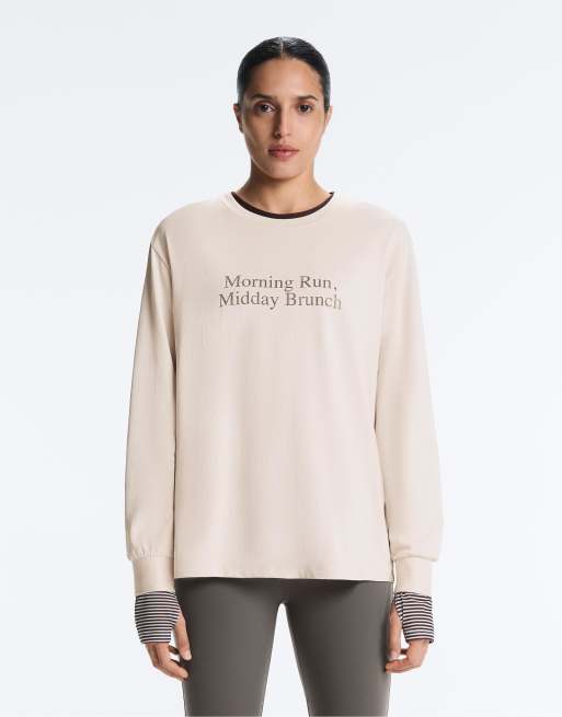 OYSHO - T-shirt a maniche lunghe in misto cotone color sabbia con scritta