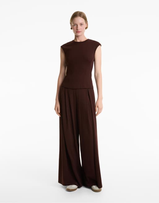 OYSHO - Top a coste a maniche corte in misto cotone e modal marrone