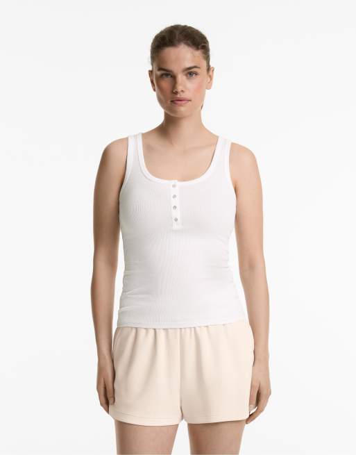 Oysho - Top senza maniche in misto cotone e modal bianco sporco con bottoni
