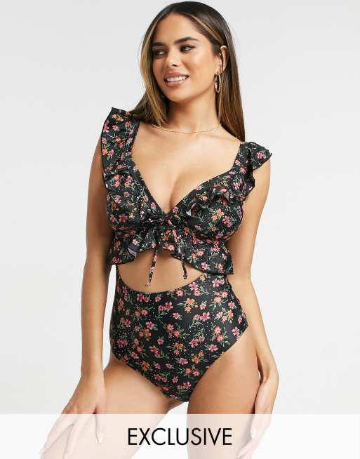 Esclusiva Peek & Beau Coppe Grandi - Trikini a fiori invernali con volant