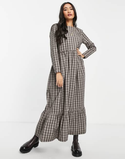 People Tree - Vestito grembiule lungo in cotone marrone a quadri