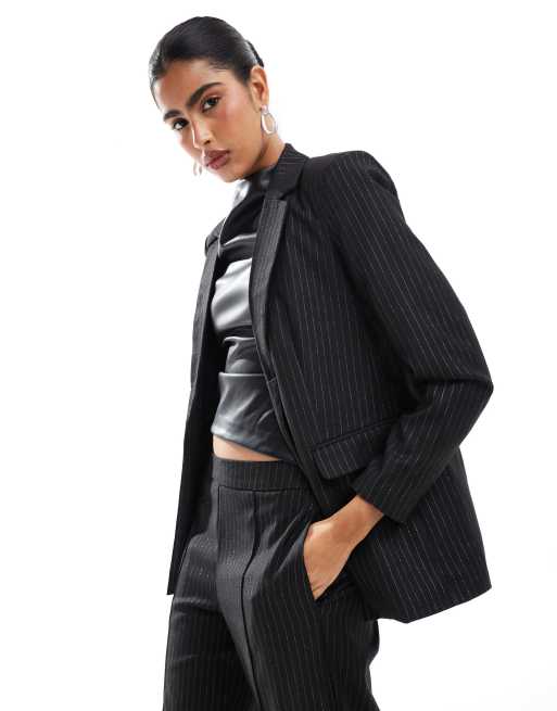 Pieces - Blazer nero gessato glitterato in coordinato