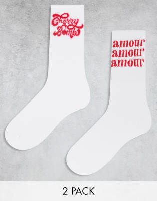 Pieces - Confezione da 2 paia di calzini color bianco e rosso con scritta