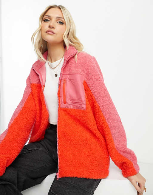 Pieces - Giacca rossa e rosa acceso color block in pile con finiture a contrasto