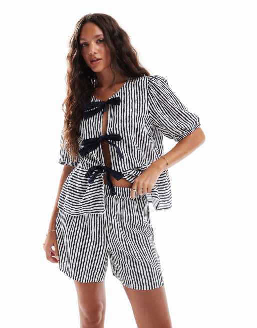Pieces - Pantaloncini a vita alta blu navy e bianchi a righe in coordinato