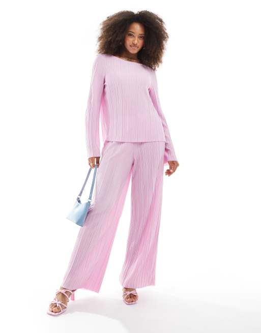 Pieces - Pantaloni plissé a fondo ampio rosa chiaro in coordinato