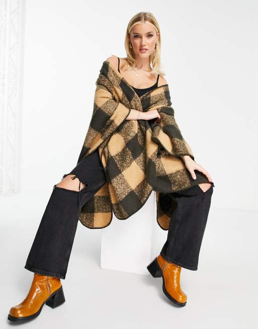 Pieces - Poncho a mantella in poliestere a quadri color cammello - MULTI