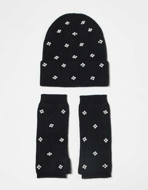 Pieces - Set regalo da 2 pezzi composto da scaldabraccia e berretto neri con perle