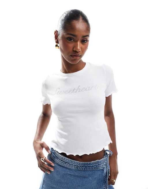 Pieces - T-shirt corta bianca con scritta "Sweetheart" di strass