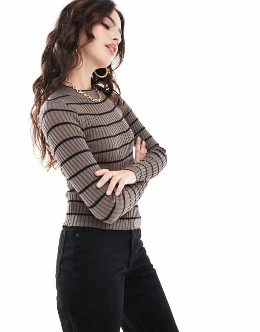 Pieces - Top a maniche lunghe in maglia spessa a coste marrone a righe