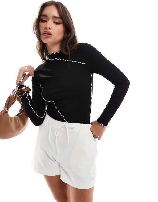 Pieces - Top a maniche lunghe nero con bordi smerlati a contrasto