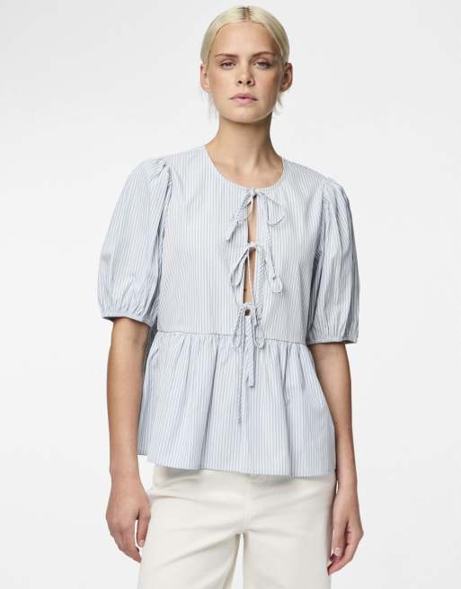 Pieces - Top in denim sbiadito con maniche a sbuffo