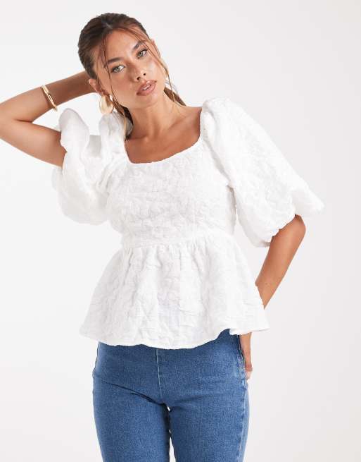 Pieces - Top premium testurizzato bianco con maniche a sbuffo e fiocco sul retro