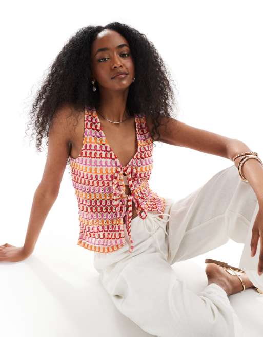 Pieces - Top senza maniche all'uncinetto rosso e arancione a righe allacciato sul davanti