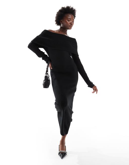 Pieces - Vestito lungo a maniche lunghe nero a coste con spalle scoperte