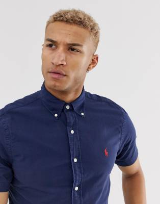 Polo Ralph Lauren - Camicia slim a maniche corte blu navy tinta in capo con colletto button-down