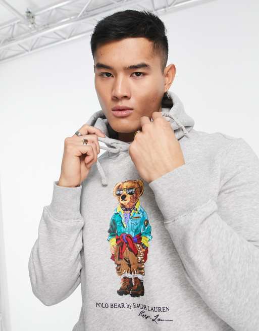 Polo Ralph Lauren - Felpa con cappuccio grigio mélange con stampa di orso outodoor