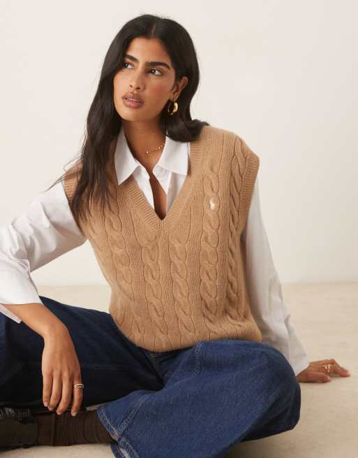 Polo Ralph Lauren - Icon - Maglione senza maniche con scollo a V in maglia misto lana a trecce color cammello con logo