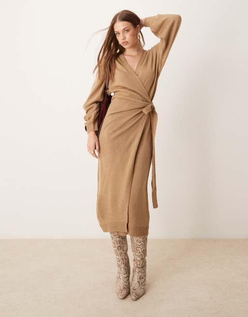 Pretty Lavish - Beau - Vestito avvolgente in maglia marrone tenue con gonna al polpaccio