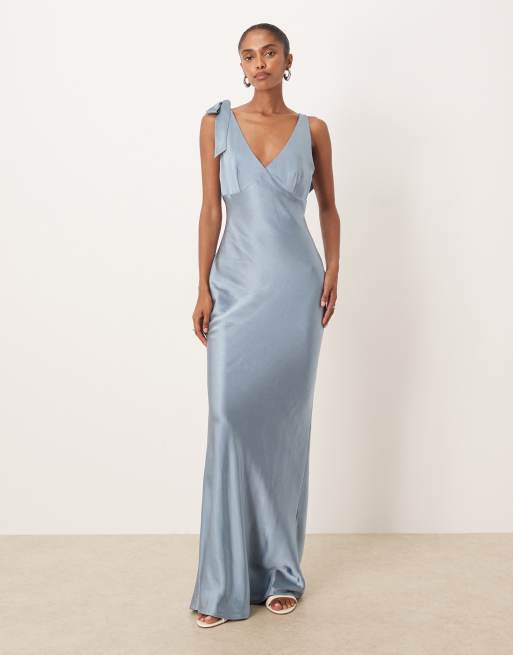 Pretty Lavish - Piper - Vestito lungo da damigella in raso blu polvere con scollo a V e fiocchi sulle spalle
