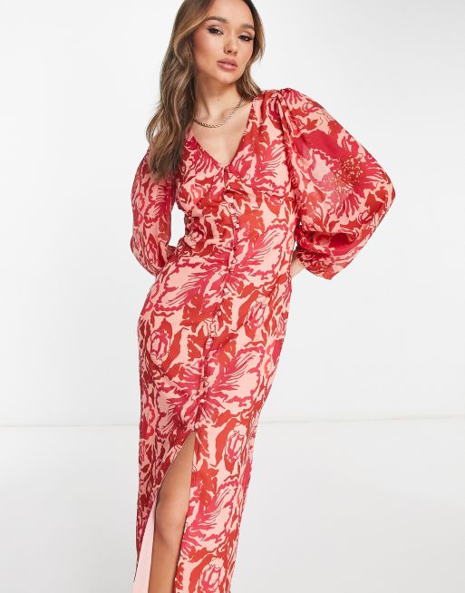 Pretty Lavish - Vestito al polpaccio con maniche a palloncino e bottoni rosso a fiori rosa