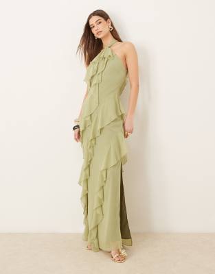 Pretty Lavish - Vestito lungo in chiffon testurizzato color oliva con volant