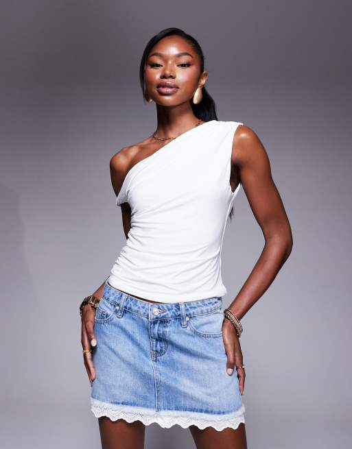 Princess Polly - Minigonna in denim blu medio con finiture in pizzo