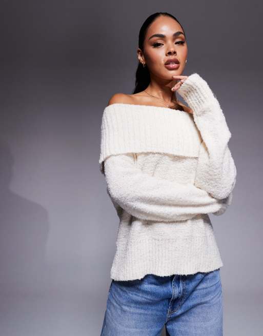 Princess Polly - Parkley - Maglione bouclé color crema con scollo profondo alla Bardot