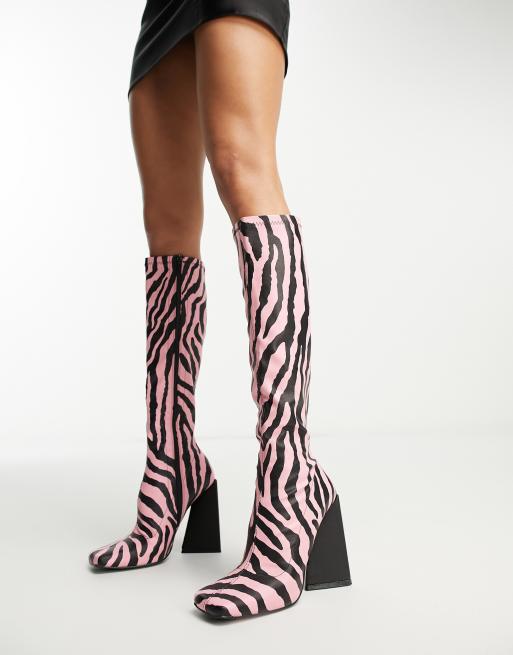Esclusiva Public Desire x Paris Artiste - Peggy - Stivali al ginocchio con tacco e stampa zebrata rosa