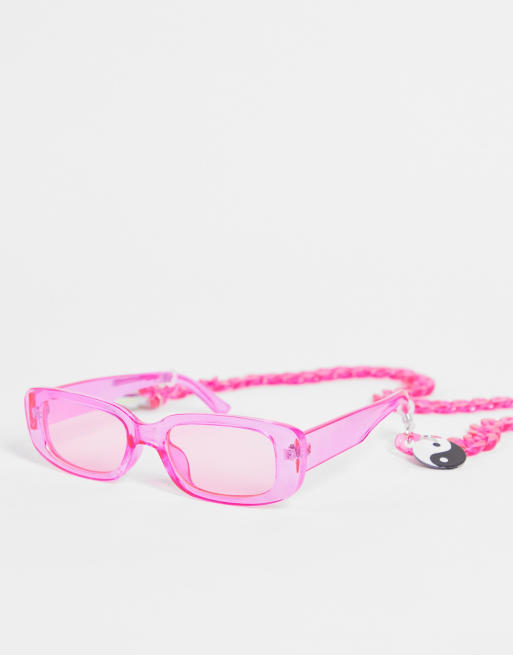 Public Desire - Occhiali da sole squadrati rosa fluo con catena rimovibile con ciondoli
