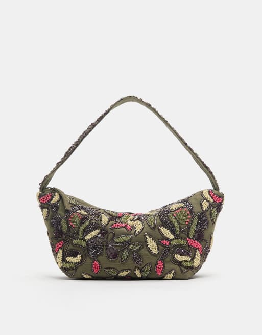 Pull&Bear - Borsa da spalla in tela kaki con perline