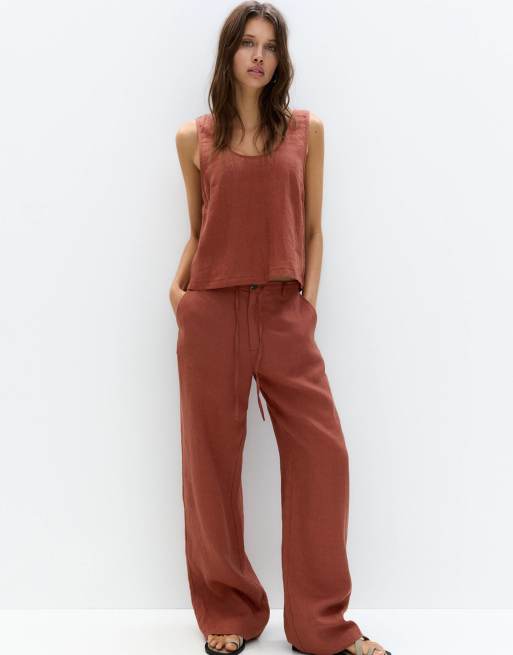 Pull&Bear - Camicia arancione in lino con scollo rotondo