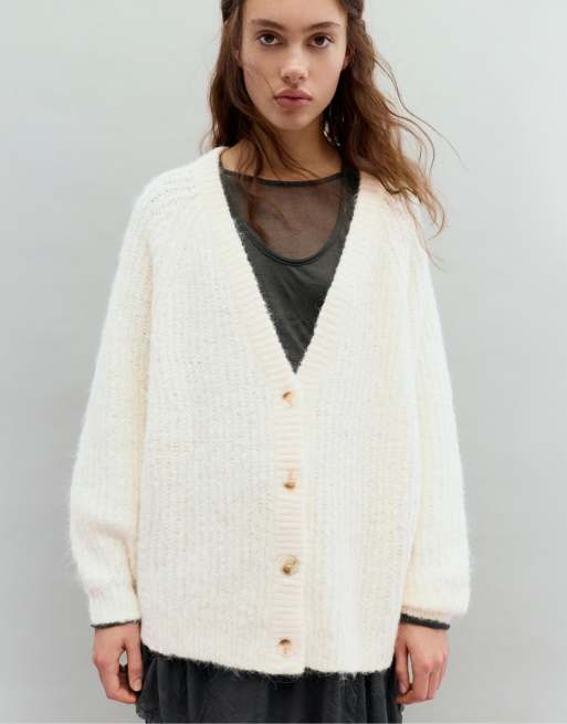 Pull&Bear - Cardigan beige in maglia rovesciata