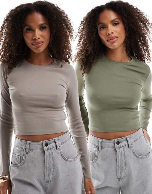 Pull&Bear - Confezione da 2 T-shirt a maniche lunghe marrone e kaki