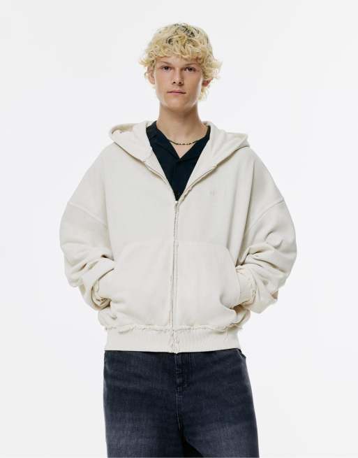 Pull&Bear - Felpa bianco sporco sfrangiata con cappuccio e zip